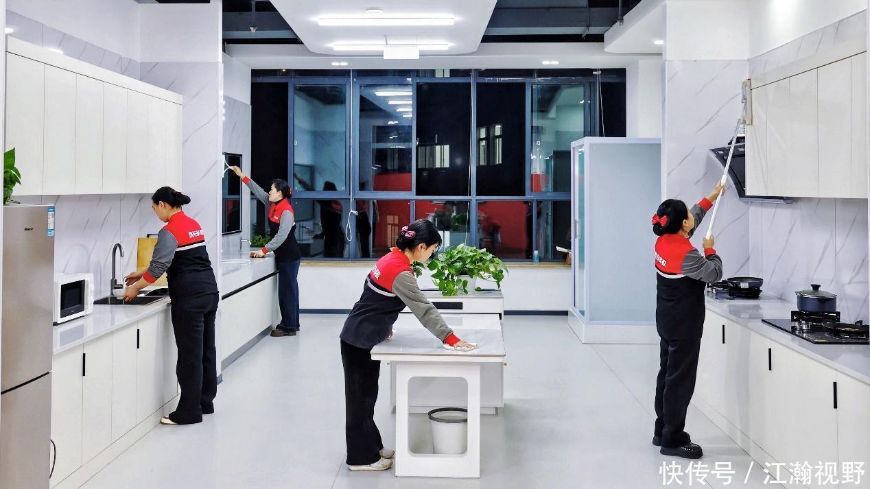 京东家政采用“场景教学+培宿一体”深度培养模式。截至目前,京东家政三级培训基地总面积已达15万平方米,相当于1万个普通家庭房间的面积,为实操培训提供了坚实的物理空间。以新启用的西南培训基地为例,基地内1:1还原真实工作场景,设有卧室、厨房、浴室等特色教学区,开设涵盖日常保洁、家电清洗、洗衣洗鞋、烹饪小时工等全品类家政实操课程。未来,京东家政还将引入AI助教与VR实训等智能化培训手段。
